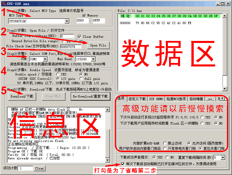 以下是烧录程序的主要界面。烧录过程非常简单,操作也非常简单。图中红色的五个大数字就表示了整个过程。简简单单的五步就可以了(实际上只需4步)。