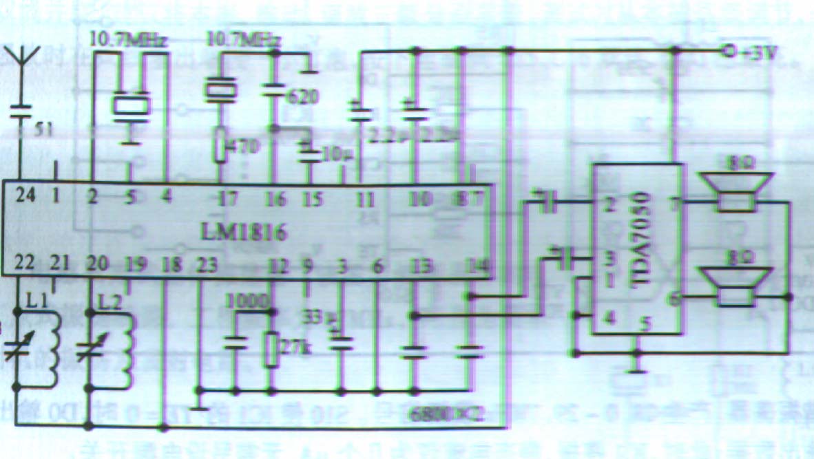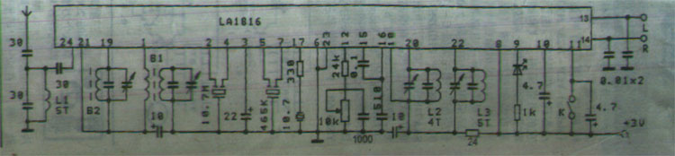 LA1816是目前较新型的单片立体声收音电路,它为24脚双列直插封装和双列扁评封装,其电参数一致。它内含AM/FM朝外差接收功能和立体声解码功能,只需少量的外围元件和外接功放即可收听调频立体声节目。下图是LA1816的原理图