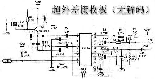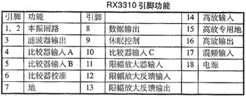 超外差接收板左侧的ANT是天线端,旁边的GND为天线地端,最好能配接特性阻抗为50欧姆的天线,也可以用一根30厘米长的导线直接接到ANT端替代天线。 RX3310A集成电路介绍: