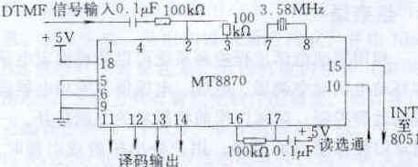 远端用户发送的DTMF信号,经搞合电容的隔直流作用后,由MT8870接收并进行译码,输出的四位并行二进制数据直接与8051单片机的P0.0~P0.3连接,MT8870在DTMF信号码变换完成后,由CID端发送中断信号INT1,通知8051数据准备好。