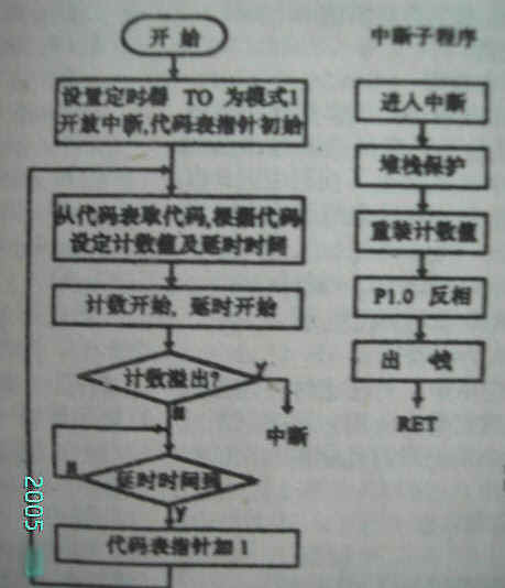 程序运行时,从代码表中依次读出各音符代码,根据高位的简码号从TAB表中取出相应的计数值送THO TLO,再根据低位的节拍数确定每个音符相应的延时时间。本程序流程图如下: