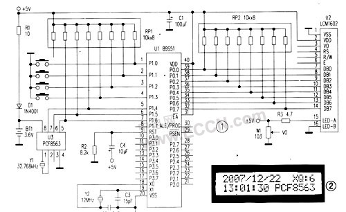 万年历时钟芯片很多,笔者认为,比起 DS1302 来说.采用飞利浦公司的 PCF8563 时钟芯片, LCM1602 作显示.可以取得较理想的效果。电路图如图 1 所示。