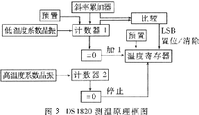 DS1820测温原理如图3所示。图中低温度系数晶振的振荡频率受温度影响很小,用于产生固定频率的脉冲信号送给计数器1。高温度系数晶振随温度变化其振荡率明显改变,所产生的信号作为计数器2的脉冲输入。计数器1和温度寄存器被预置在-55℃所对应的一个基数值。计数器1对低温度系数晶振产生的脉冲信号进行减法计数,当计数器1的预置值减到0时,温度寄存器的值将加1 ,计数器1的预置将重新被装入,计数器1重新开始对低温度系数晶振产生的脉冲信号进行计数,如此循环直到计数器2计数到0时,停止温度寄存器值的累加,此时温度寄存器中的数值即为所测温度。图2中的斜率累加器用于补偿和修正测温过程中的非线性,其输出用于修正计数器1的预置值。