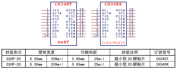 在红外方式下,CH340 外加红外收发器即可构成USB 红外线适配器,实现SIR 红外线通讯。