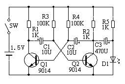 接通电源后,由于接线电阻、分布电容、元件参数的不一致等因素。三极管必然是一只导通,一只截止。当Q1导通,Q2截止时:C2经R2、Q1的基极-发射集充电,充电电流为IC2充,C1经R3、Q1集电极-发射极放电,电流为IC1放,同时电源正极经R1、Q1集电极-发射极到负极形成回路。随着C1的放电及反方向充电,当C1的右端(即Q2的基极)电位达到0.7V时,Q2由截止变为导通,其集电极电压U2=0,由于C2两端电压不能突变,Q1基极电位变为-VCC,Q1由导通变为截止,电路翻转为另一暂稳状态,当Q2导通,Q1截止时原理以其相反。当Q2截止时,LED不亮,当Q2导通时,电容C3通过Q2给D1放电,LED点亮。如此周而复始地自动翻转、闪亮。振荡周期T=0.7(R3C1+R4C2)通常选R3=R4=R,C1=C2=C。则T=1.4RC,振荡频率F=1/1.4RC。