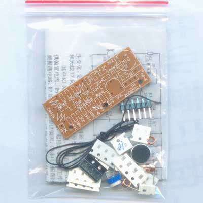 贴片3管无线话筒元件包,装好后就是一个无线话筒,又学习了贴片元件的焊接和练习。FM调频工作方式,音质好,用普通的收音机即可收听。话筒把声音信号变为电信号后,先经一级音频电压放大再送调制级,这样可以拾取更远更微弱的声音。振荡调制后的高频信号再经一级调谐功率放大才送天线发射,发射距离更远及减少手碰天线对振荡级的影响,减少谐波。按照本电路装好后,频率大概在83MHz左右,只需把线圈L的匝距拨开一点,使其振荡频率工作在88MHz—108MHz即可,就可以配合任何FM收音机接收到该高频信号,并从该高频信号还原出声音信号。另外装有外接音频插座及可调电阻调节输入音频信号的衰减量。一、性能参数: