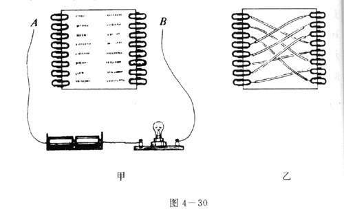图4-30乙表示长方形硬纸板的背面,用若干条带绝缘包层的导线分别把左右两排中一对一对的曲别针连接起来,每对曲别针对应于一个问题和这个问题的正确答案。只有在图甲中把接线头B与对应于正确答案的那个曲别针接触,小灯泡才亮,表示你选的是正确答案.
